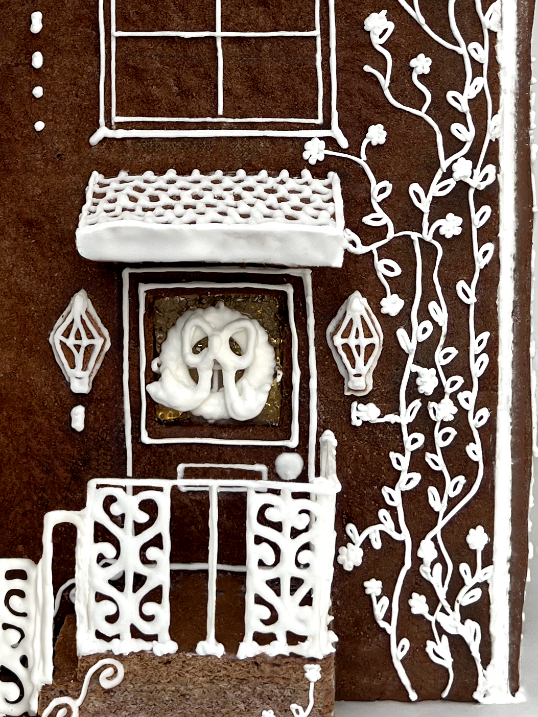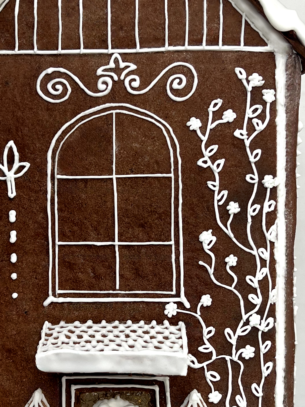 A two-storey architectural build with technical construction, precise window work, highly detailed piping and illustrated scenes on each side, balancing precision with atmosphere. Made with LPK Medovníky-style dough that adds a lasting fragrant aroma to the build.